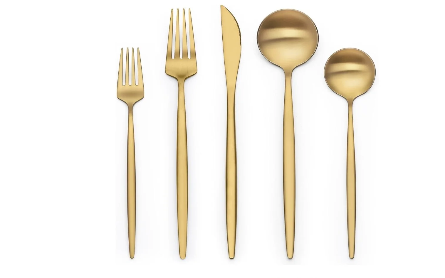 Matte Flatware for a sleek look includes dinner forks, dinner spoons, dinner knives, teaspoons, salad/dessert forks.